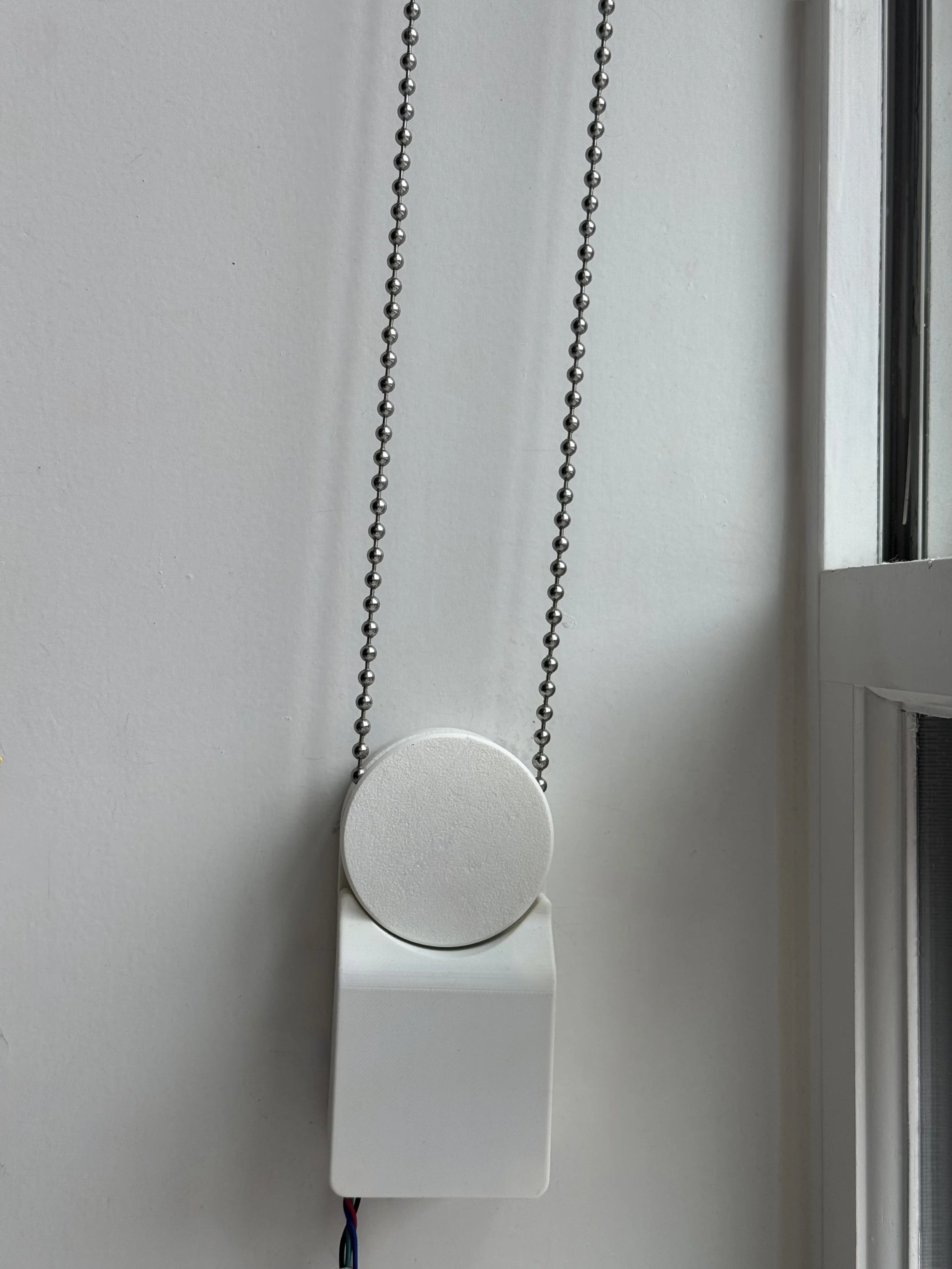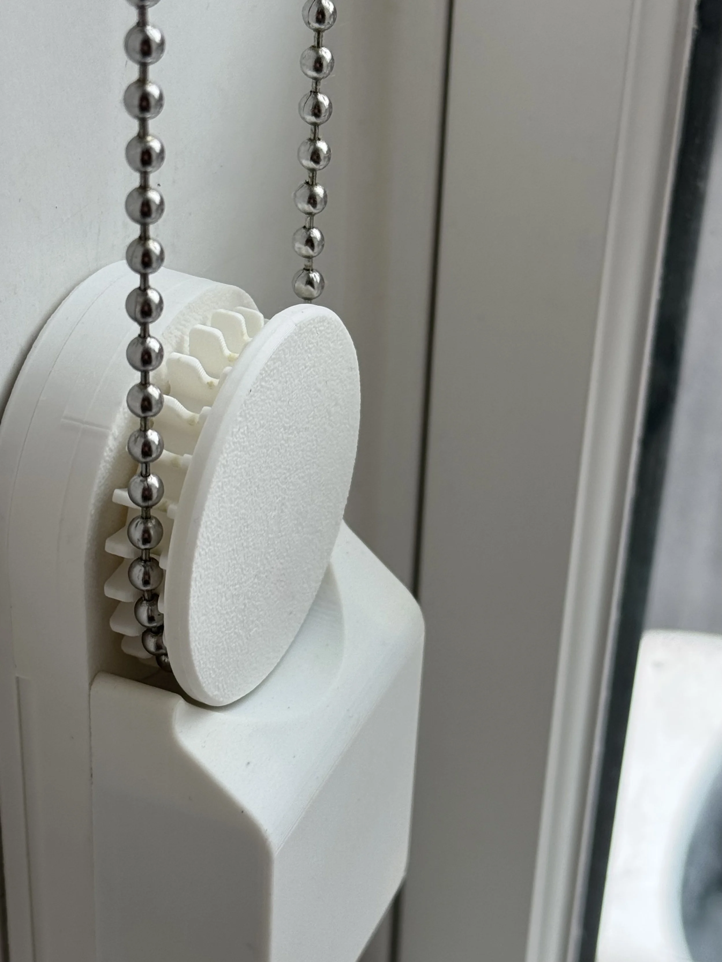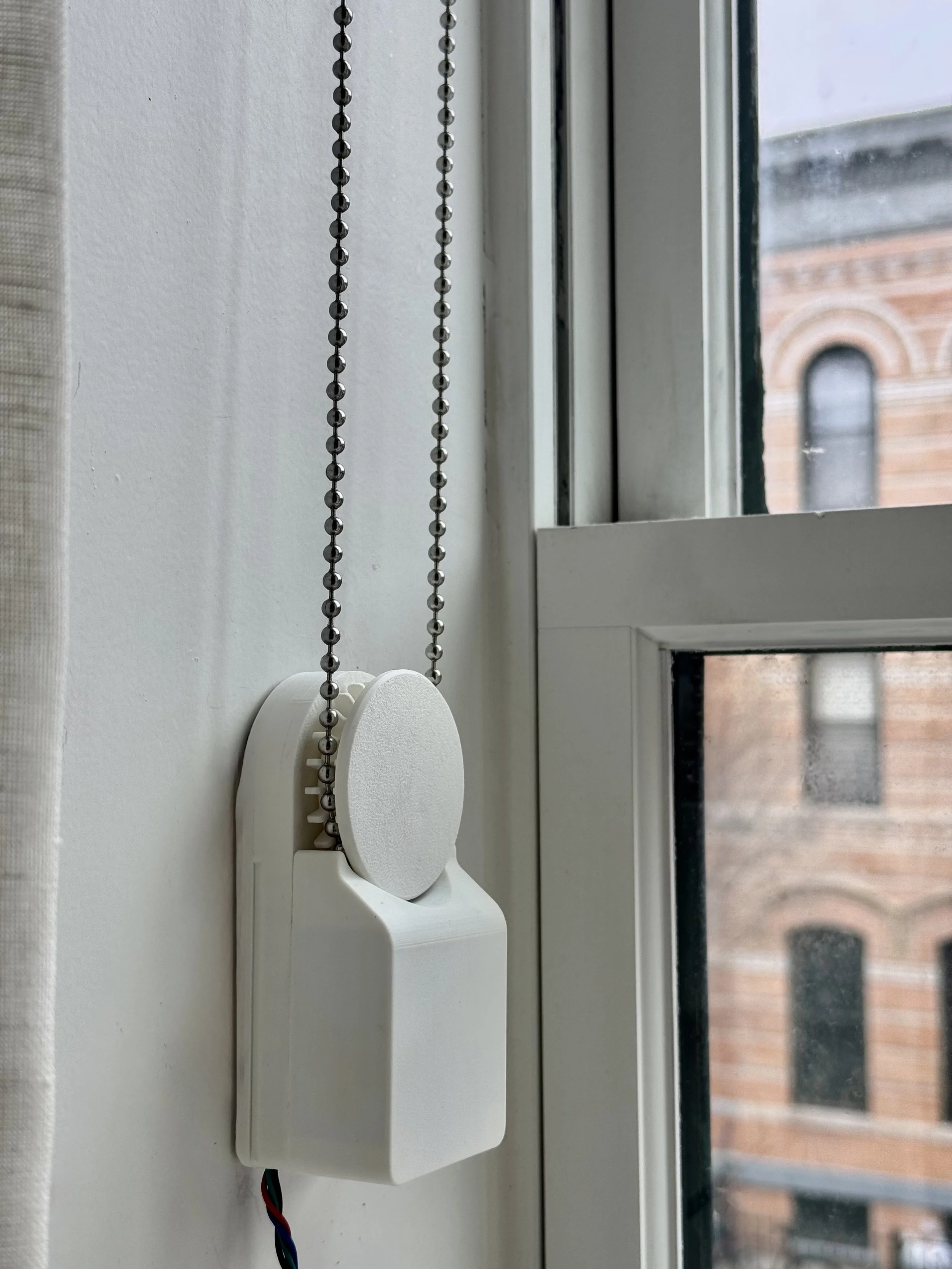 The design consists of a pancake stepper motor driving the blinds through a set of gears that increase the overall torque output of the device. A magnetic cover hides the motor and allows for sufficient airspace for cooling. The chain is driven by a custom drive interface that captures and pulls the individual chain balls.