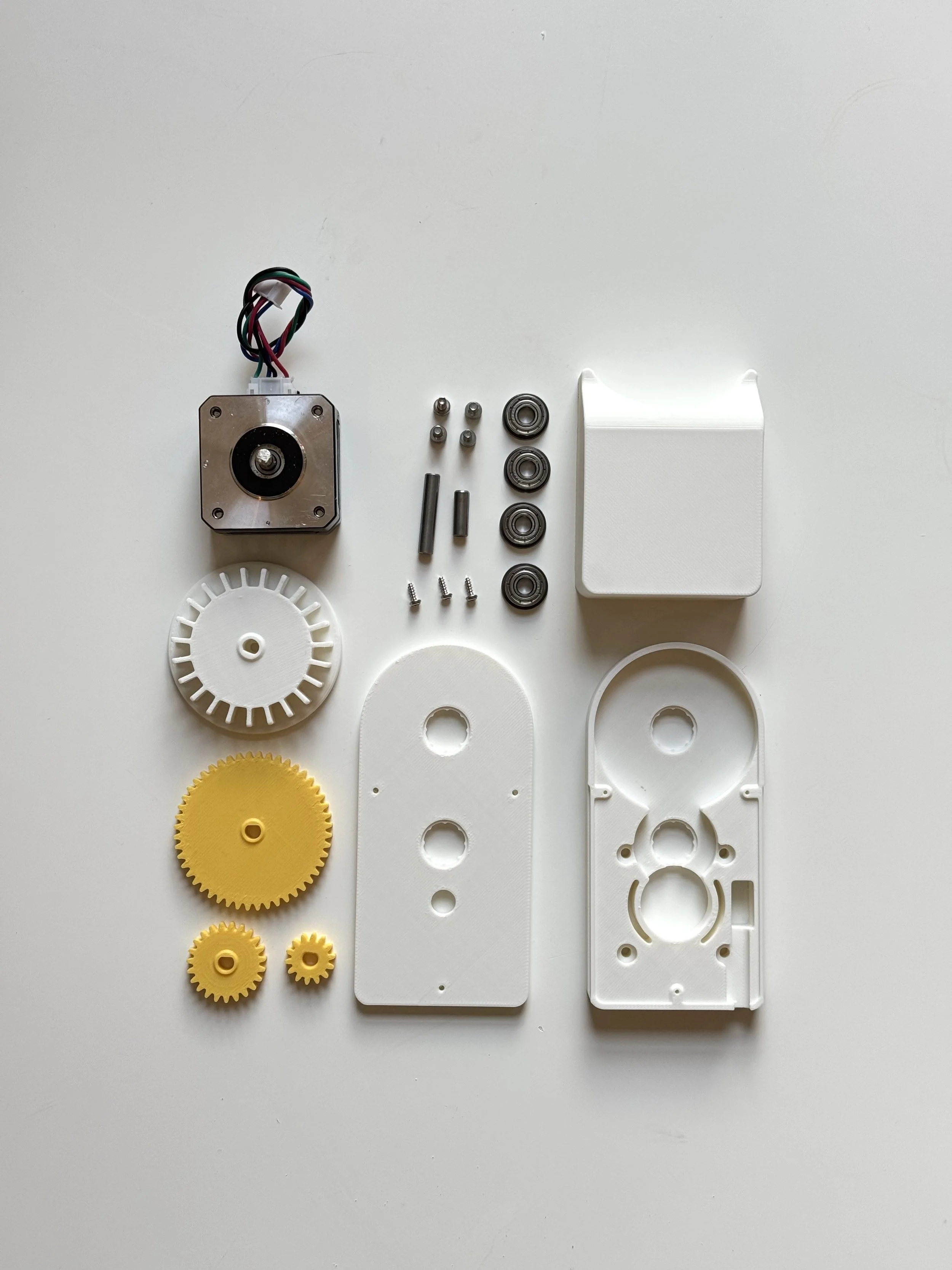 All components are 3D printed apart from the motor, keyed shafts, bearings, and self tapping screws.